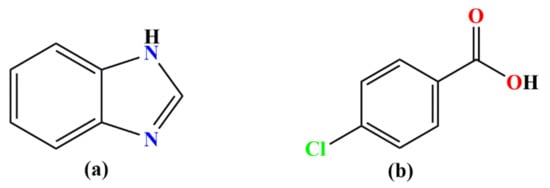 There have been numerous studies directed at the synthesis of new metal complexes with potential biological activity [1,2,3,4,5,6]. The use of transition metals with biologically active ligands yields new compounds with higher activity when compared with the metal ion or the coordinated ligands [7,8,9,10]. Benzimidazole (BZDH) is an N-containing heterocyclic compound that has been well documented over many years. Benzimidazole (BZDH) is known to be a monodentate ligand (Figure 1a) coordinating through the heterocyclic nitrogen atom [11]. A plethora of studies of benzimidazole and its derivatives have shown pharmacological activities [12,13,14]. Due to these properties, benzimidazole and its derivatives have been widely used until now as coligands with several metal ions in coordination chemistry [11,15,16,17,18,19,20,21,22,23,24]. The mode of coordination of nitrogenous donor ligands with other coligands, with respect to the metal center in the same system, can enhance the biological activity of metal complexes [24,25,26]. Metal ions such as copper have been studied and empirical evidence about their biological activity in many biochemical processes has been attained [27]. Copper ion is known to be one of the most widely studied metals in coordination chemistry because of its biological relevance and various applications [4]. Copper(II) carboxylate with pharmacological ligands is known to be more effective in combating and treating diseases compared to its parent ligands [9,28,29]. 4-Chlorobenzoic acid (4Clbz) bears one -COOH group (Figure 1b) that can fashion into monodentate, bidentate and multidentate modes of coordination [30,31,32,33,34,35]. According to the Cambridge Structural Database (CSD), and to the best of our knowledge, this is the first system that comprises 4-chlorobenzoic acid and benzimidazole with a copper center. In this paper, we aim for the synthesis, characterization, DFT calculation and antimicrobial activity of a new CuII complex with 4-chlorobenzoate in the presence of benzimidazole. By using a molecular docking study, Cu(II) complex, 4-chlorobenzoic acid and benzimidazole were treated with DNA gyrase (1KIJ) to observe their various interactions and binding affinities.