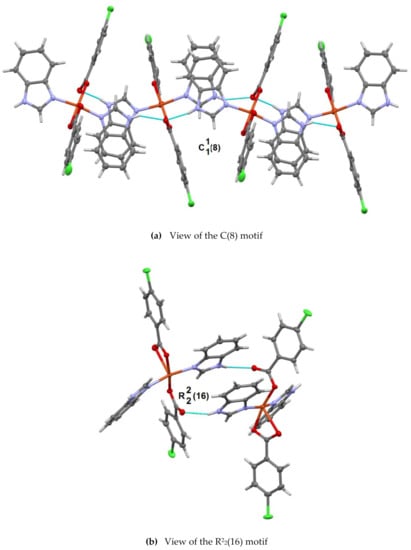 The mononuclear CuII complex crystallized in the monoclinic system with the centrosymmetric space group P21/c. The molecular structure of 1 is shown in Figure 2. Selected bond lengths are given in Table 2. The five-coordinate Cu atom is surrounded by two trans monodentate benzimidazole ligands and two 4-chlorobenzoate anions in which one carboxylate is monodentate and the other is in a chelating bidentate mode. The bond valences around the CuII ion were computed according to Brown [49] and O’Keeffe and Brese [50] as νij = exp[(Rij – dij)/0.37], where Rij is the bond valence parameter (in the formal sense, it is the single-bond length between the i and j atoms) and dij is the observed bond length. The sum of the bond valences formed by the atom is assumed to be equal to the valence (formal oxidation state) of the atom. The RCu-O and RCu-N values were taken as 1.679 Å and 1.713 Å, respectively [51]. The four strong Cu-O and Cu-N equatorial bonds have bond valences ranging from 0.43 to 0.49 and the axial Cu-O2 bond of 2.440(2) Å has a bond valence of 0.13. Finally, the valence of the five-coordinate Cu atom is consistent with the valence sum rule (Vi = Σνij), which gives VCu = 1.95 v.u. The calculated valence of the very long contact Cu∙∙∙O4 of 3.0219(19) Å is only 0.027 v.u., indicating the lack of interaction between these two atoms. The observed square pyramidal (SQP) environment of the CuII complex is slightly distorted toward a trigonal—bipyramidal (TBP) coordination, with the trigonality parameter τ = 0.045 (as defined by Addison et al. [52], where τ is equal to 0 for a regular SQP structure and 1 for TBP). The N-···O hydrogen bonds [N2-H1…O4#I and N4-H2…O4#II] (Table 3) link the molecules into the chains extending along the crystallographic b-axis (Figure 3a), with a C(8) first-level graph-set motif [53,54]. According to the second-level graph theory, the molecules are joined in pairs of dimers to form the ring motif R22(16) (Figure 3b). The combined effect of the sterically hindered carboxylate ligand and the intramolecular hydrogen-bonding interactions changes the binding mode of the carboxylate ligands from bidentate to monodentate. This rather unusual environment around the central atom was previously observed in Cu, Fe and Co complexes [54,55,56].