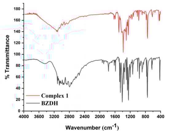 The infrared spectra of Complex 1 and benzimidazole were recorded in the 4000–400 cm−1 region and are presented in Figure 4. Important assignments were discussed as follows: the absorption bands in the region 3200–2900 cm−1 showed the presence of C-H aromatic and N-H stretching vibration of the benzoate anion and benzimidazole in Complex 1. The stretching band of C-Cl was observed at around 743 cm−1. The appearance of a new band in the region of 1624 cm−1 is assigned to the C=C stretching vibration in the benzoate molecule. The absorption band at 1551–1499 cm−1 is assigned to the v(C=N) stretching vibration. The bands observed at 1595 cm−1 are assigned to the asymmetric vibration of the carboxylate group of chlorobenzoate and two other bands were seen on the spectra, namely 1385 and 1352 cm−1, which are assigned to the symmetric vibration of the carboxylate group of chlorobenzoate. The differences in Vas(OCO) and Vs(OCO) are 210 and 242 cm−1, which are indicative of the asymmetric bidentate mode of coordination and monodentate mode of coordination of the carboxylato groups to the center Cu(II) [57]. The peaks at 547 and 439 cm−1 are assigned to Cu-O and Cu-N [58] for the p-chlorobenzoate moiety and stretching band for benzimidazole. These illustrations correspond to the crystal structure of Complex 1.