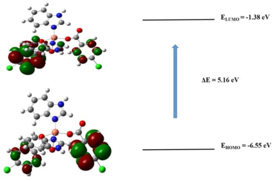 The frontier molecular orbital (FMOs) calculations were performed using quantum chemistry. The DFT approach is a popular way to describe the distribution of electron densities. The corresponding EHOMO and ELUMO values were found to be −6.55 eV and −1.38 eV, respectively, for 1. The HOMO–LUMO gap (i.e., ∆E) for 1 was found to be 5.16 eV (Figure 10). To comprehend the distribution of isodensities, HOMO and LUMO surfaces were investigated revealing most distributions of isodensities on heteroatoms.