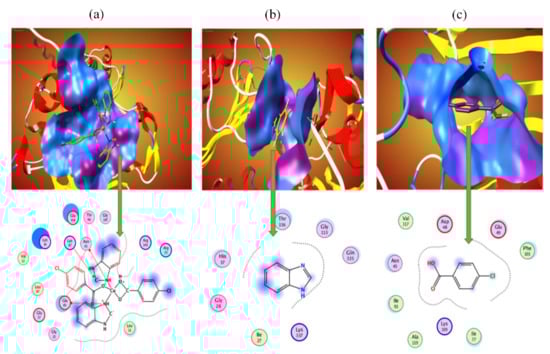 In an attempt to comprehend the enzyme inhibition activity of the newly synthesized Complex 1 and its ligands, the molecular docking approach was employed to determine the strength of interactions and binding modes. Pose view analysis and conformations of Complex 1 and its ligands with the lowest free energy are depicted in Figure 12a–c for the DNA gyrase enzyme. It is revealed that 1 is the most potent compared to its ligands due to having the highest negative free energy value (26.31 kJmol−1), evident in Table 5. Docked Complex 1 and its ligands with 1KIJ were analyzed for various types of interactions such as hydrogen bonding, hydrophobic and van der Waals interactions. These interactions express the ability to block the active sites of 1KIJ. The 2D ligplot indicates that the high binding affinity of Complex 1 compared to its ligands are attributed to its greater interactions with residues of 1KIJ which furnishes three electrostatic interactions. The ligplot in Figure 12a indicates that the N+ of Complex 1 develops electrostatic interactions with the negatively charged –O of the asparagine Asn(95) residue of 1KIJ, whereas the negatively charged carbene of 1 also develops electrostatic interactions with the positively charged −H of lysine Lys(87). Another interaction is between the positively charged N+ of 1 and negatively charged O of glutamic acid Glu(85). On the other hand, organic ligands of 1 only develop hydrophobic interactions with the core of the enzyme pocket leading to their lower binding affinity compared to Complex 1 (Figure 12a,c).