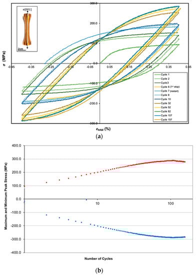 (a) The cyclic deformation of [001]-oriented copper single crystal at 298 K. Strains are plastic and elastic. (b) The evolution of the maximum and minimum peak stress versus the number of cycles confirms saturation is reached.