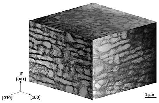 Figure 2 illustrates the 3-dimensional microstructure based on TEM images taken from the (100), (010), and (001) planes of the cyclically deformed copper []. The stress axis is parallel to the vertical [001] direction. The heterogeneous labyrinth dislocation microstructure consisting of orthogonal high dislocation density walls and low dislocation density channels is observed. Dislocation density in the walls and channels of the labyrinth structure was 8.6 × 1014 m/m3 and 1.55 × 1013 m/m3 respectively [].