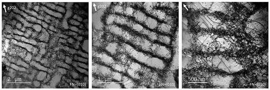 Transition electron microscope (TEM) micrographs of the labyrinth structure from the {010} planes of the cyclically deformed copper.