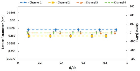 Figure 5 shows the lattice parameter measurements and stress calculations corresponding to different positions within the channel. The data are obtained from four channels in two TEM foils. The horizontal axis shows the distance from the walls normalized by the channel width. The average channel width is 0.36 μm and the wall width is about 0.12 μm. Minor scatterings exist in the lattice parameters of different channels that is ±2 × 10−4 nm. Identical values of lattice parameters in each channel show that the internal stresses are homogenous in the channel and close to the walls of the labyrinth dislocation microstructure. Comparing the lattice parameter of cyclically deformed copper single crystal with that of unstrained copper indicates that the internal stresses are minimal. Considering Brown’s note on permanent softening, this weak backstress is in line with the fact that the measured cyclic softening in our test was weak [,]. Of course, it is possible that internal stresses exist and are less than the measurement error. The accuracy of lattice parameter measurements is about ±1 × 10−4 nm. The error in stress measurements is then approximately ±18 MPa that is 6.5% of the applied axial stress of 275 MPa.