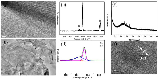 Characterization of the GO (a) TEM-5 nm, (b) TEM-0.5 μm, (c) Raman, (d) XPS, (e) XRD, (f) HR-TEM.