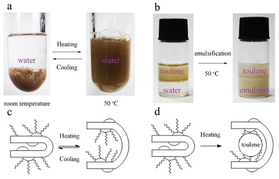 The thermo-responsive property of GO-POM: (a) photograph of the aqueous dispersions of GO-POM; (b) photograph of the emulsion stabilized by GO-POM with an oil-to-water volume ratio of 1:1 (left: room temperature; right: after heating to 50 °C); (c) hydrophobic and hydrophilic nature of GO-POM at different temperatures; and (d) emulsion stabilized by GO-POM.