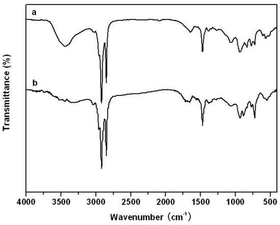 FT-IR spectra of the catalyst: (a) fresh catalyst, (b) used catalyst.