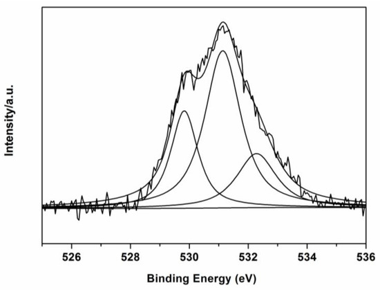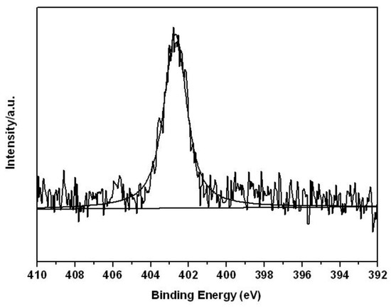 The XPS confirmed that two types of tungsten with oxidation states of 6+ and 5+ were present in the GO hybrid (Figure 4), while the peaks at 35.2 and 34.5 eV were corresponding to W (VI) and W (V) [44], respectively. The presence of W (V) was attributed to the formation procedure. Firstly, Na2WO4 reduced GO to form reduced GO and W (V), and the tungsten species were linked on the surface of the GO. H2O2 oxidized the reduced GO and W (V). Some surfactant N,N-dimethylhexadecan-1-amine was then added, which surrounded some tungsten atoms and prevented them from being oxidized by H2O2 (Table 2). Consequently, some W (V) was present. The molar ratio of W (VI) to W (V) was approximately 0.79 according to the relative peak intensity of W4f. The XPS N1s peak (Figure 5) at a binding energy of 402.7 eV was assigned to the nitrogen in cetamine oxide [45]. The O 1s XPS (Figure 6) features at 532.9 eV were attributed to the peroxide [46].