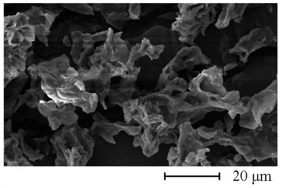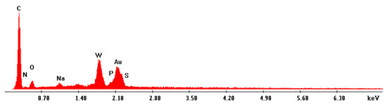 Based on scanning electron microscope (SEM) images (Figure 8), the GO-POM sheets were found to be self-folded (Figure 2c). The EDS analysis of the GO-POM surface showed that the W loading amount was 39.0 wt. %. The EDAX results (Figure 9) suggest that the molar ratio of P:W was 2.4:1.