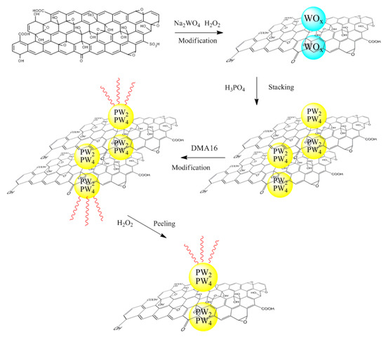 The fabrication of this material was completed as follows (Scheme 1) (Details in Supplementary Materials): (1) GO was dispersed in water and first coated with peroxotungstates obtained by reacting Na2WO4 with H2O2, which provided a hydrophilic layer on GO; (2) H3PO4 was added, which led to the stacking of GO lamellae as the pH decreased. pH is known to be very important in the exfoliation/stacking processes of GO lamellae [41], and a low pH leads to the stacking of GO lamellae. The other role of H3PO4 is to react with peroxotungstates to form peroxo-phosphotungstates (PPT), which provide the catalytic center for the epoxidation reaction; (3) Surfactant N,N-dimethylhexadecan-1-amine (DMA16) was added to the above mixture and reacted with peroxo-phosphotungstates through anion–cation interaction to fabricate a hydrophobic layer; (4) Lastly, H2O2 was added to exfoliate the GO lamellae to form the GO-POM hybrids containing one hydrophilic PPT side and one hydrophobic side. As result, amphiphilic GO-POM was fabricated using this strategy. To successfully fabricate this material, the additions of H3PO4 in the second step and H2O2 in the final step are essential.