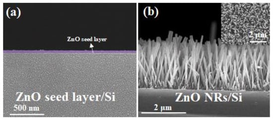 (a) Seed layer and (b) SEM cross-sectional view of ZnO-NRs; the illustration shows a top-view SEM of the ZnO-NRs.
