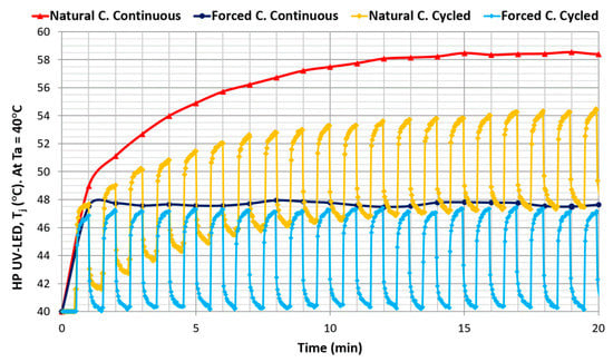 The junction temperature (Tj) of the UV LED was measured at Ta = 40 °C for natural convection and forced convection, and for the continuous and cycled (30 s on/30 s off) working modes. Continuous and cycled Tj under natural convection is shown in red and orange; Tj under forced convection is shown in light and dark blue.