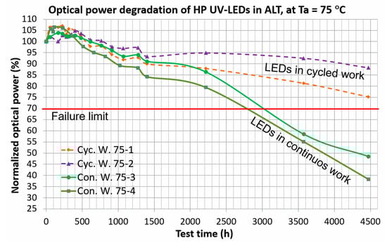 The six LEDs tested in nominal continuous working mode (two for each ambient temperature ALT) failed due to degradation of optical power to under 70% (L70) of the initial value. The six LEDs tested in cycled working mode, with only half the time of real-time operating, did not fail by degradation during the ALT period; the worst performance occurred at 90 °C, where the average cycled UV LEDs had roughly 75% optical power at the end of the test.
