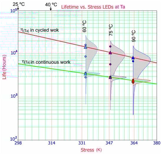 The increase in the time operation parameters (η(Tj), B50(Tj) and B10(Tj)) in continuous working over natural convection at Ta = 40 °C is 4.6%, and 7.7% for cycled mode. For example, the η(Tj) at Ta = 40 °C values applied to the Weibull equation are 4803 h for continuous working and 24,020 h for cycled working.