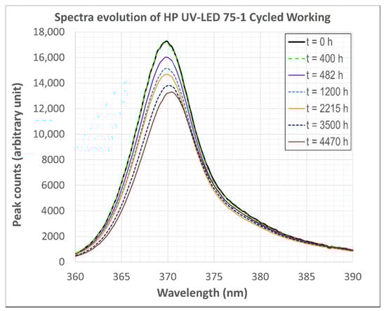 In Figure 5, the spectra evolution of the Led 75-1 working at Ta = 75 °C and cycled mode can be seen. The wavelength peak shift due to aging is very low, with 0.78 nm of increase, and the initial value was 369.93 nm. The break of silicone in this LED happened between 2215 h and 3500 h, which explains the additional ratio decrease between both measurements.