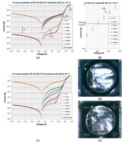 Figure 6 shows the different characterizations realized outside the climatic chamber at 25 °C. Figure 6a shows the I–V curve evolution in the ALT of UV LED 75-1 from Figure 3, tested at Ta = 75 °C with cycled working; Figure 6b shows the detailed I–V curve evolution of LED 75-1 in the nominal working condition with an injected current of 0.6 A; Figure 6c shows the I–V curve evolution in the ALT of LED 75-3 tested at Ta = 75 °C with continuous working; Figure 6d shows a photograph of the final encapsulation condition of 75-1; and Figure 6e shows a photograph of the final encapsulation condition of 75-3.