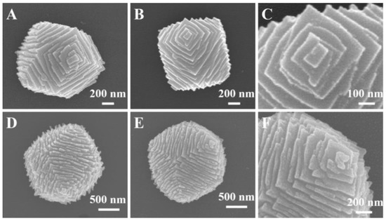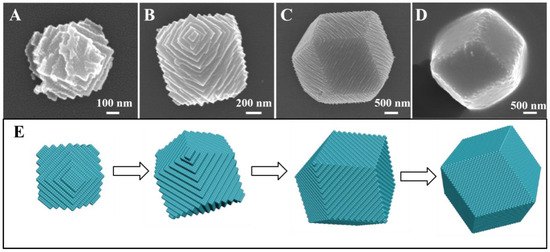 To further investigate the growth process of the HSANs, we adjust the reaction parameter. Unsurprisingly, we find the ideal morphological changes by tuning the reaction time and the result is in line with our conjecture. Figure 5 shows the structural evolution of HSANs. Obviously, it was observed that the number of steps transformed from less to more, and the step sizes were converted from large to small relatively. We propose that the HSANs are nanometers-scale at the initial reaction time with 20 min using 5 M AgNO3 aqueous solution (Figure 5A). After reaction for 30 min, the morphology of the superstructures was regular (Figure 5B). At 60 min UV-irradiation, we yielded the large superstructures with the most step edges and its topography turned into rhombic dodecahedra-like regular structure (Figure 5C). With further extension of UV irradiation from 60 min to 95 min, the products, such as rhombic dodecahedra, gradually turned from hierarchical into relatively smooth without the change of size (Figure 5D). Our novel morphology can be well explained by the BCF theory [5,6,7]. The step edges became more and more and new product atom can be added because there is no need to overcome the energy barrier to form new steps [2]. Thus, the superstructures have little steps and large terrace width and the slopes of growth hillocks are small at this condition (see Figure 5A). With increase of supersaturation, the slopes of growth hillocks become larger (see Figure 5B,C). Obviously, the order of the degree of supersaturation (σ) in Figure 5 is: σA < σB < σC, and the slopes of growth hillocks is: pA < pB <pC. The supersaturation of the system plays a vital role in the surface morphology of HSANs. The whole structural evolution of HSANs is illustrated schematically in Figure 5E. In short, our novel morphology originates from a cube, where the growth hillocks generate. Then the edges of the hillocks become more and more and the slopes of growth hillocks become larger. At a particular time, new crystal steps are no longer formed, as a result, the surface of the superstructures become smooth. Finally, HSANs evolve into polyhedral, such as rhombic dodecahedra. In our system, supersaturation is low, so the crystallization of superstructures is dominated by screw-dislocation-driven growth mechanism. As schematic diagram shown, supersaturation is becoming larger in this reaction procedure and is of great significance for the whole structural evolution. The samples with little steps are difficult to be observed, so we propose that HSANs grown fast at first, then we could obtain plenty of samples with more steps, which means slower growth rate.