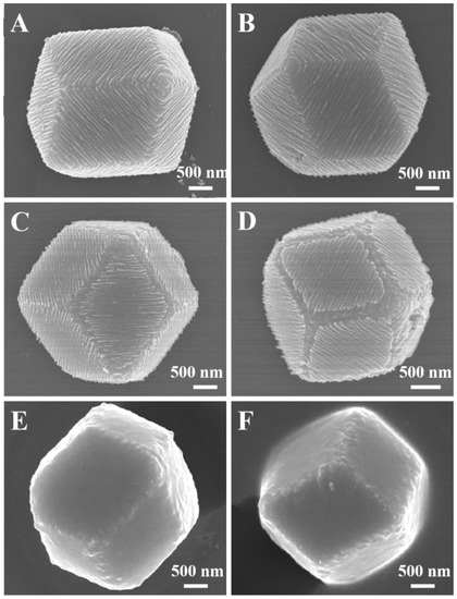 Typical SEM images of HSANs, such as rhombic dodecahedra, grown from a 5 M AgNO3 aqueous solution with different irradiation time: (A,B) 60 min, (C,D) 70 min, (E,F) 95 min.