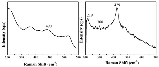 The samples were further characterized using TEM. Figure 6A,B shows typical TEM images of HSANs prepared from 30 min and 60 min UV-irradiation. The size of the superstructures is smaller compared with Figure 6B. As depicted in Figure 6B, the surface of the sample is smooth and its size is larger according to Figure 6A. The selected area electron diffraction (SAED) pattern, which was taken from near the edge of Figure 6B, is shown in Figure 6C. The electron diffraction rings could be corresponded with lattice parameter of both Ag and Ag2O. The SAED pattern resolved the 1/3 {422}, {200}, and {220} reflections of fcc silver, with measured d-spacings of 2.49, 2.01, and 1.49 Å, respectively. Besides, the SAED pattern also resolved the {111} and {123} reflections of primitive cubic Ag2O, with the measured d-spacing of 2.75 and 1.27 Å, respectively, which confirm the truth of partial oxidation of Ag. Figure 6D–F depicts the high-resolution TEM image of the superstructures acquired near the edge of Figure 6B, which clearly resolves the simultaneous presence of Ag and Ag2O phase. The lattice fringes with a measured d-spacing of 2.35 Å agree with the (111) reflection of fcc silver. Besides, the lattice fringes with a measured d-spacing of 2.75 Å indexed to the (111) lattice of primitive cubic Ag2O. Figure 6F discloses the lattice fringes with a d-spacing of 2.49 Å, which can be ascribed to the forbidden reflection of 1/3 {422} [28], in agreement with the XRD pattern and SAED pattern. Figure 6D indicates the {111} twin planes in the Ag particles. Because the amount of AgO is too small, we have not obtained the corresponding data. Moreover, the HSANs synthesized through 60 min UV-irradiation were also characterized by normal Raman. As shown in Figure 7, the broad band at 490 cm–1 can be ascribed to Ag2O [27,29]. Raman peaks at 219, 300, and 429 cm–1 can be attributed to AgO [27,29].