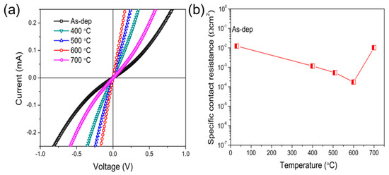 (a) Current–voltage (I–V) curves of the PdAl/Au metal stack contacts to p-AlGaN as a function of annealing temperature. (b) Specific contact resistance (ρc) as a function of annealing temperature of PdAl/Au/p-AlGaN ohmic contacts.