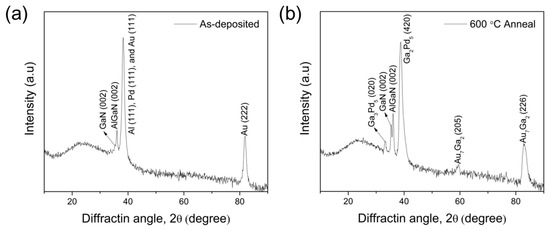 X-ray diffraction (XRD) plots of the PdAl/Au metal stack on p-AlGaN (a) as-deposited and (b) annealed at 600 °C.