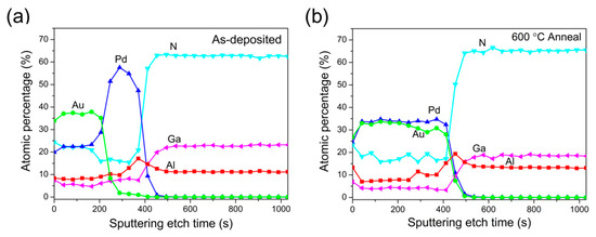 Depth-profiling of the PdAl/Au metal stack on p-AlGaN using X-ray photoelectron spectroscopy (XPS): (a) as-deposited and (b) annealed at 600 °C.