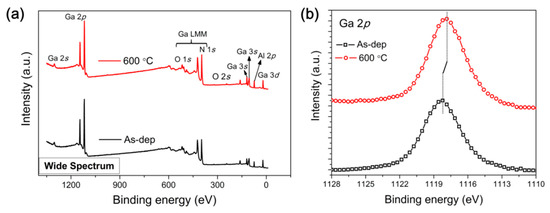 To further analyze the surface spectra of metallic Ga states, XPS measurements are performed before and after annealing at 600 °C. Figure 4a shows a characteristic wide spectrum of the XPS survey, where all core-level and energy features with electronic transitions of Ga, N, and Al are evident. As shown Figure 4b, the Ga-metallic 2p surface-energy-level spectra are found on the interface of PdAl/Au and p-type AlGaN before and after annealing at 600 °C. Unlike the as-deposited contact, the Ga-metallic 2p surface energy level of the annealed contact (600 °C) shifts in the direction of the lower binding energy side. The ~0.36 eV binding energy shift of the metallic Ga 2p XPS peak is observed compared to the as-deposited contact. This behavior is related to the fact that the surface Fermi energy level moves toward the valence band side [16]. The reason for the reduction in energy band bending (i.e., the bending of the surface Fermi energy level toward the valence band side) in the 600 °C annealed contacts could be due to reduction in the Schottky barrier height between the PdAl/Au metals and p-AlGaN films, which results in a low ρc value. This surface Fermi energy-level shift can be initiated to increase Ga vacancies in p-AlGaN, which act like acceptors to enhance the acceptor concentration near the p-AlGaN surface of the annealed contact. A similar influence of annealing was observed in the Pt/Pd/Au and Pd/Au contacts on p-AlGaN [10,11].