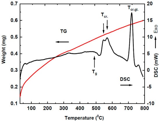 The thermogravimetry (TG) curve recorded on the prepared glass sample showed a monotone increase with the temperature, but several peaks were observed on the DSC curve (Figure 1). The weak endothermic decrease at about 500 °C was assigned to the glass transition temperature Tg and the sharp exothermic peak at about 710 °C to the bulk crystallization of the glass (Tcr.gl). Between 525 and 600 °C, we observed a composed exothermic peak Tcr. that was assigned to the glass ceramization associated with the precipitation of BaCl2 and β-BaB2O4 phases within the glass matrix [], as was shown by XRD analysis (see below). The inset of the crystallization observed at 530 °C (Figure 1) agreed with the value of 521 °C recorded on a barium borate glass with a similar composition (i.e., the ratio ΣBa: 2B = 1.7) [].