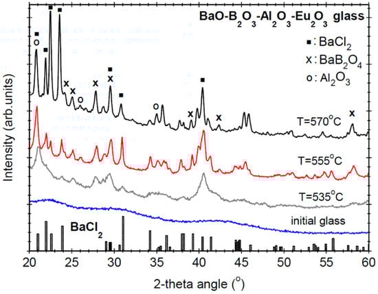 The XRD pattern of the initial glass showed several broad peaks at 21.5, 31, and 41.5°, consistent with its amorphous structure (Figure 2). The glass ceramization started at 535 °C (i.e., right below the composed exothermic peak Tcr). The XRD patterns of the glass ceramic samples (Figure 2) showed the diffraction peaks assigned to the precipitation of the orthorhombic BaCl2 phase accompanied by the peaks due to the β-BaB2O4 crystallites []; weaker peaks due to Al2O3 from the crucibles were also observed []. The stable phase of BaCl2 has an orthorhombic PbCl2 structure (space group D2h16, Pnma) with the lattice parameters a = 7.865 Å, b = 4.731 Å, and c = 9.421 Å (PDF 00-024-094) [].