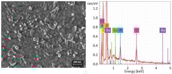 The EDX spectral analysis of the glass-ceramic samples showed the presence of elements from the precursor chemicals: 7 at%(C), 72 at%(O), 9 at%(Ba), 2.5 at%(Al), 9 at%(Cl), and 0.5 at%(Eu). There was a deviation from the batch composition that was assigned to the chlorine loss during the melting caused by the chemical interaction of the oxychloride melt with water vapor or oxygen [].
