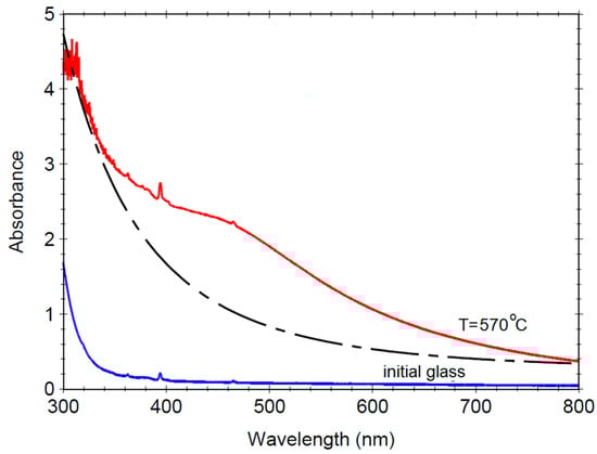 Optical absorption spectra of initial Eu-doped chloroborate glass and glass-ceramic after 570 °C annealing; the doted curve represents the λ−4 Rayleigh scattering dependence curve.