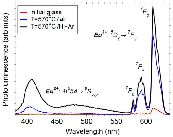 Photoluminescence spectra of the initial Eu-doped chloroborate glass and glass-ceramic annealed at 570 °C in an air and reducing atmosphere (H2–Ar) under a 350 nm excitation wavelength.
