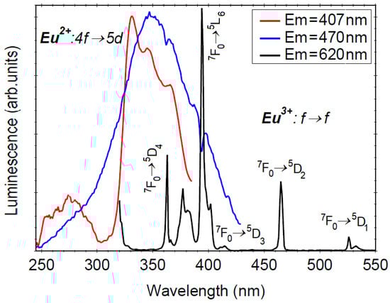 Photoluminescence excitation spectra recorded on the Eu-doped chloroborate glass-ceramic after annealing at 570 °C in a reducing atmosphere (H2–Ar).