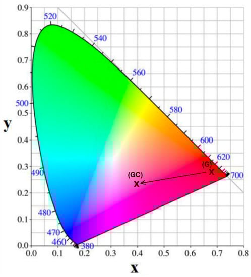 The chromaticity coordinates of the Commission Internationale de l’Eclairage (CIE) chromaticity diagram of the Eu-doped chloroborate glass (G) and glass-ceramic (GC) samples.