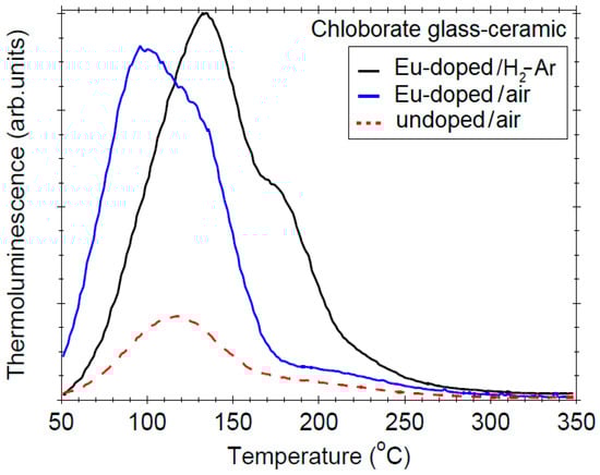 Thermoluminescence curves recorded on undoped and Eu-doped chloroborate glass-ceramics are depicted in Figure 8. The glow curve recorded on undoped glass ceramic and BaB2O4 showed a broad band between 75 and 400 °C [], which was assigned to the thermal recombination of defects within the BaB2O4 nanocrystalline phase. The glow curve recorded on the Eu-doped glass-ceramic (annealed in air) showed two peaks at 97 and 134 °C with a higher magnitude than in the undoped sample, but much weaker than in the Eu2+-doped BaCl2 nanocrystalline powder. The same glow peaks were observed in the glass-ceramic annealed in a reducing atmosphere, where 134 °C was the dominant feature, accompanied by a shoulder at about 180 °C. The high temperature peak at 134 °C has been observed on Eu2+-doped BaCl2 nanocrystalline powder, and it has been assigned to the recombination of F(Cl) centers in the BaCl2 crystalline lattice []. During the heating, the electrons are thermally released from the F(Cl) trapping centers and recombine with holes trapped as Eu3+/(Eu2+- hole) centers giving rise to the excited (Eu2+)* ions and radiative emission according to: