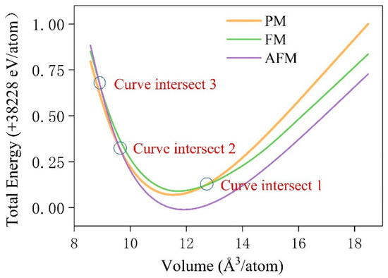 In order to check for the structural stability in paramagnetic (PM), ferromagnetic (FM) and antiferromagnetic (AFM) phases for L12-(Ni,Cu)3(Al,Fe,Cr), the total energies are calculated as a function of unit cell volume and fitted to Birch Murnaghan equation of state (BM3-EOS) [24]. The obtained energy versus volume curves are shown in Figure 1. It can be clearly seen that the L12-(Ni,Cu)3(Al,Fe,Cr) is stable in the AFM phase in the ground state because it shows the lowest total energy of the AFM configuration corresponding to the equilibrium lattice constant. Interestingly, the curves have three intersection in the figure, implying that magnetic phase transition among PM, FM and AFM phases for L12-(Ni,Cu)3(Al,Fe,Cr) would probably happen under high temperature and high pressure, which are discussed in Section 3.3.