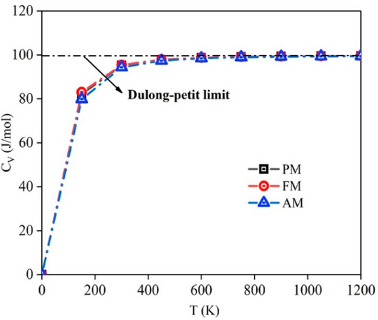 The thermal property provides valuable information on the specific performance of solids under the application of temperature, and it plays a very important role in helping understanding on phase transition. In this paper, the quasi-harmonic Debye model [14] in the temperature range of 0 to 1200 K and pressure range of 0 to 60 GP is studied to derive thermodynamic properties of three magnetic phases in L12-(Ni,Cu)3(Al,Fe,Cr), as this method has been successfully applied to various thermodynamic calculations [33]. The knowledge of the heat capacity is one of the most important thermodynamic properties which not only provides essential insight into its vibrational properties but also is mandatory for many applications [33]. Figure 2 shows the heat capacities at a constant volume (CV) of PM, FM and AFM phases for L12-(Ni,Cu)3(Al,Fe,Cr) as functions of the temperature under 0 GP. As it can be seen, all magnetic configuration HEAs show the same changing trend with increasing temperature: CV is proportional to T3 at low temperature and converges to the Dulong–Petit limit at high temperature, which obeys the change law. It is should be noted that the concentration of magnetic behavior has little influence on the heat capacity behavior, due to the values of CV of all phases for (Ni,Cu)3(Al,Fe,Cr) being extremely similar. In other words, the CV is not sensitive to the presence of magnetism as the temperature increases.