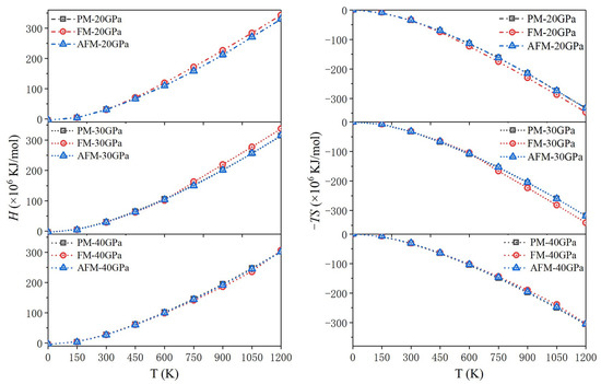 In order to investigate magnetic phase transition of the L12-(Ni,Cu)3(Al,Fe,Cr), the Gibbs free energy G as a function of temperature at constant pressures was calculated by the equation G = H − TS, and the two components of enthalpy H and entropy contribution −TS were also studied, which are shown in Figure 3 and Figure 4. It is clear that from Figure 3, for all phases, the variation tendency of the H and −TS at 20, 30 and 40 GPa are, to some extent, similar. The H increases as the temperature increases, while the −TS monotonously decreases. As pressures rise, the values of H and −TS of all phases for L12-(Ni,Cu)3(Al,Fe,Cr) are very close, this means the concentration of magnetic behavior has little influence on the H and −TS at high pressure; this is because magnetism in 3d metals is typically suppressed by the application of pressure [34,35]. Figure 4 shows that as the pressure increases, the G values increase, demonstrating that high pressure significantly affects the system energy and reduces the stability of HEAs. Moreover, upon comparison of the values of G, H and −TS, the variation tendency of G is the same as the −TS, but contrary to the H, suggesting that −TS has a primary contribution to Gibbs free energy, that is to say that the entropy may play a key role in the phase transition in the annealing process.
