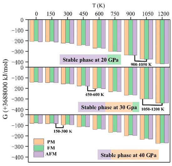 Generally, the smaller the G, the more stable the material is. It should be noted that in Figure 4 there are two energetically favorable phases from 0 to 1200 K under 20 and 40 GPa, showing that the magnetic phase transformation will occur from the AFM to FM phase in the temperature range of 900 to 1050 K at 20 GPa, and from the AFM to PM phase in the temperature range of 150 to 300 K at 40 GPa, respectively. In particular, the tow phase transformation will occur under 30 GPa; the phase change temperatures are 450~600 and 1050~1050 K, respectively.