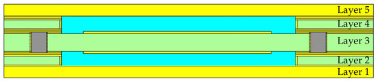 In this particular structure, two sealed cavities are performed on layers 2 and 4 by cutting the substrate. Hence, the vertical walls of these cuts are plated to perform the sidewalls of the equivalent waveguide (see Figure 2). It is important to notice that layer 3 (the middle one) is used as a support to build a second conductor, which is decoupled to the walls of the waveguide, as depicted in Figure 3c. The top and bottom conductors of this layer 3 are, respectively, the bottom and top horizontal walls of the two sealed cavities created. The two conductors of layer 3 are connected to the same voltage through a PTH, thus enabling their use to polarize the LC in the cavities by using a low frequency field.