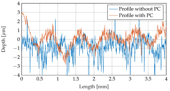 It is interesting to note the difference between waviness and roughness in measurements of Figure 4. In this case, waviness is caused by sanding the copper surface with 400 grit sandpaper, but this waviness does not hinder the effect of the alignment layer. However, the profile without PC has an average roughness (high frequency variation over the envelope) of 417 nm that can interfere with the microgrooves that conform the alignment layer. In this case, the PC deposition was able to reduce this average surface roughness by 26%.