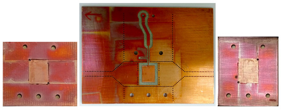 Figure 3c shows the third layer (the most relevant one) of the proposed resonator. The microwave frequency signal (RF) is fed by a Coplanar Waveguide with Lower Ground Plane (CPWG) that allows for the measurement of the devices by using SMA connectors. The RF field is transmitted, using a tapered transition, from the CPWG to a SIW line created in layer 3. This SIW line is implemented by two PTH rows with 0.5 mm of diameter and a separation pitch of 0.7 mm, and the width of this structure was designed to have a cutoff frequency of 6.25 GHz [22]. This SIW line feeds the resonator by using an equivalent coupling window implemented with PTH, the RF signal is transmitted in the two cavities that will contain the LC and also in the substrate of layer 3 through a weak coupling, see Figure 9. Conversely, the low frequency signal (bias voltage) can be applied to the polarization patch through an integrated biasing network and a phoenix connector, which allows us to apply more than 300 Vpp.