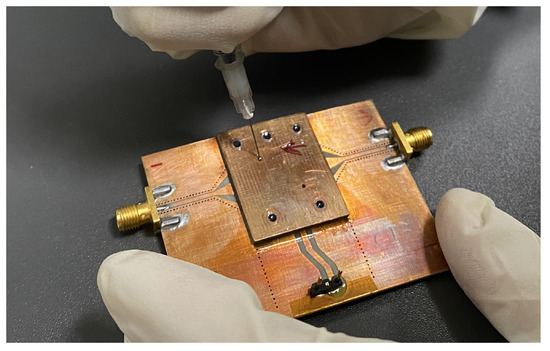 The two cavities created in the resonator were then filled with MERCK GT3 23002 liquid crystal using a syringe (see Figure 7) and sealed with NORLAN UV glue.