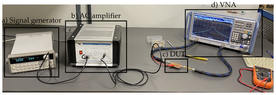 Measurement setup: (a) Signal generator, (b) AC voltage amplifier, (c) Device Under Test (DUT) and (d) Vectorial Network Analyzer (VNA).