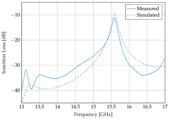 In order to improve the method accuracy, the frequency response of the empty resonator was firstly measured, and the geometry of the simulation model (length of resonant cavity and width of coupling window) is adapted to match the experimental results. Figure 9 shows the measured response and the adapted one. It can be noticed that simulation and measurement do not perfectly fit outside the resonance frequency area; this deviation is due to assembling and manufacturing tolerances in the feeding network (connectors and transitions). However, since the resonator is low coupled with this feeding network, these tolerances have a low impact on resonance frequency and quality factor.