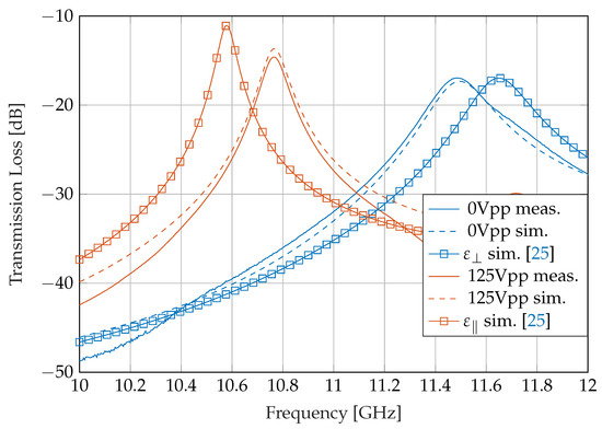 Figure 10 shows the frequency response of the resonator at steady state, with = 0 and at parallel state, with = (125 ), versus two adapted simulations. On the one hand, it shows the extracted values of complex permittivity at the two bias voltages (in dotted lines in the graph) in the materials filling the cavities. On the other hand, it shows the simulation with and (in squared lines in the graphs) known from a previous work [25] at this frequency, in which a more accurate method was employed. These results have been included for validation purposes.