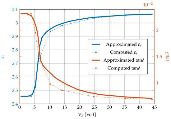 When the electrical properties of the parallel and perpendicular state of polarization of the LC is computed (, , , and ), the value of these quantities in intermediate states can be approximated by using the measured frequency and quality factor at different bias voltages. As can be seen in Equation (4), the resonance frequency, of a rectangular resonant cavity, is inversely proportional to the permittivity of the filling material, , while the quality factor, Q, is directly proportional to the loss factor, , Equation (5). Knowing these extreme points and the proportionality relationship ( with and Q with ), the curves for resonance frequency versus permittivity and quality factor versus loss tangent can be inferred. These approximated values can be used as starting points to compute the intermediate polarization states applying the same optimization process used for , , and . Inferred and extracted values of and can be seen in Figure 11.