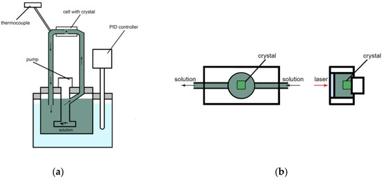 The setup consisted of two parts: a crystallizer (placed in a thermostat) with a pump for supplying the solution to the cell at different flow velocities (Figure 2a) and a flow-through cell (Figure 2b).