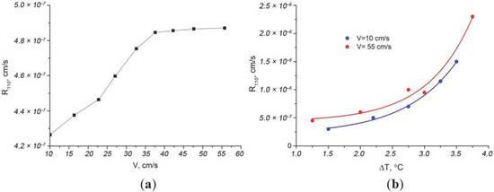 KCNSH solutions saturated at T = 40.0 °C were used in these experiments. Before the experiments, the dependence of the normal crystal growth rate on the solution flow velocity was measured so as to determine when the growth process reached the kinetic mode (Figure 3a), when exactly the crystal growth, but not the delivery of the substance to the crystallization front, was the factor limiting the growth rate. One can see that the transition to the kinetic mode occurred at V ≈ 37 cm/s. In the experiments with the change of flow velocity, the values V = 10 cm/s and V = 55 cm/s were chosen as the most distant from the transition point. The kinetic characteristics of the crystal growth at these solution flow velocities were also measured (Figure 3b).